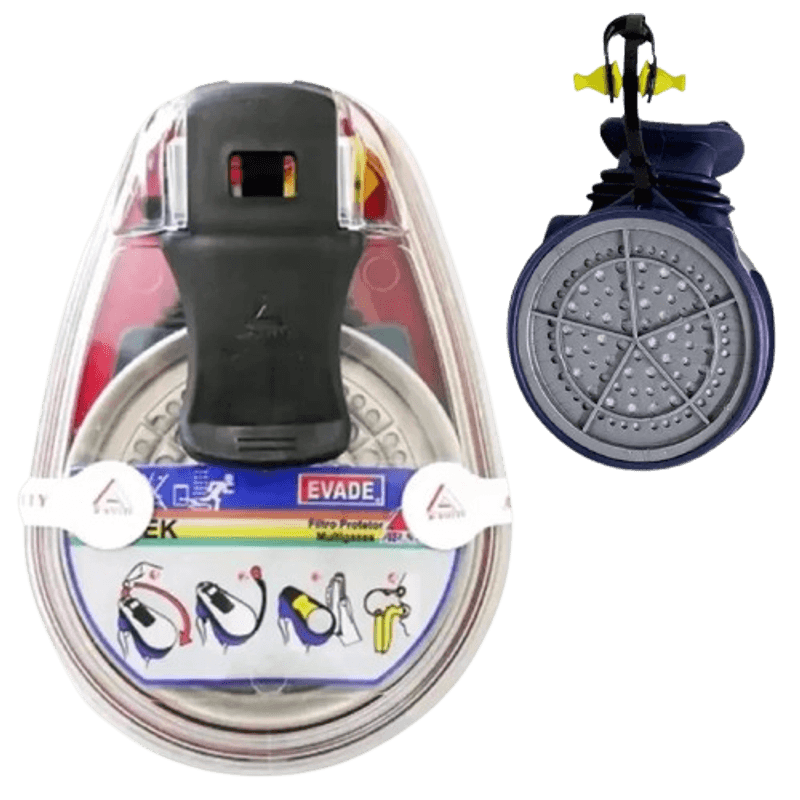 · O RESPIRADOR DE FUGA II EVADE, é um purificador de ar para fuga, confeccionado em silicone azul ou amarelo, com bocal